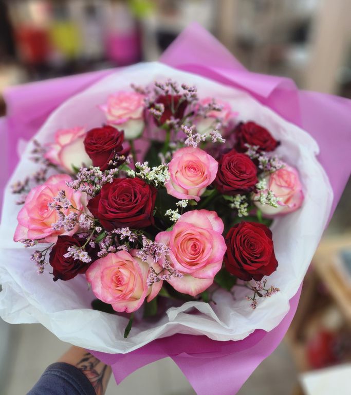 Букет из 15 роз Россия " Микс", лимониум, с оформлением